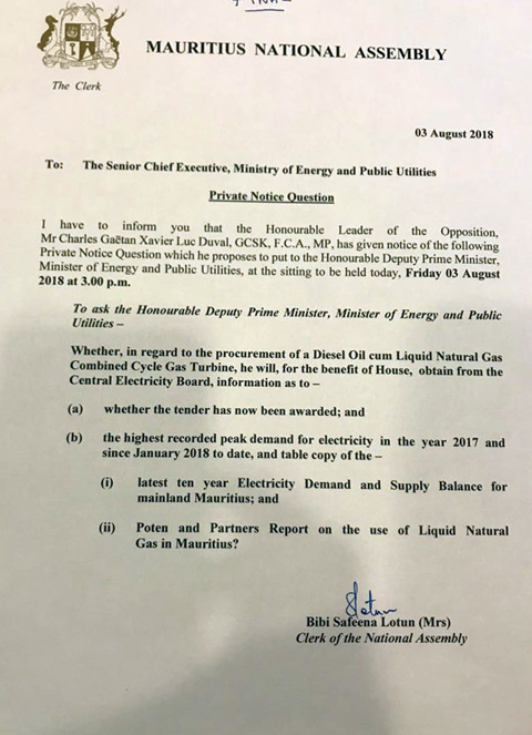 Le contrat pour la fourniture de diesel pour le Liquid Natural Gas Combined Cycle Gas Turbine (CCGT) a-t-il été alloué ? C’est la question que posera le leader de l’opposition, Xavier-Luc Duval, au Premier ministre adjoint, Ivan Collendavelloo, lors de la Private Notice Question (PNQ) dans l’après-midi de ce vendredi 3 août.