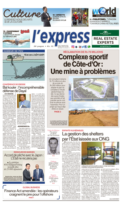 En une : Réclamations de Rs 75 millions – Complexe sportif de Côte-d’Or : une mine à problèmes ; Conférence de presse – Bal Kouler : l’incompréhensible défense de Dayal ; Enfants vulnérables – La gestion des «shelters» par l’État laissée aux ONG ; Ressources marines – Accord de pêche avec le Japon : l’État ne reculera pas
