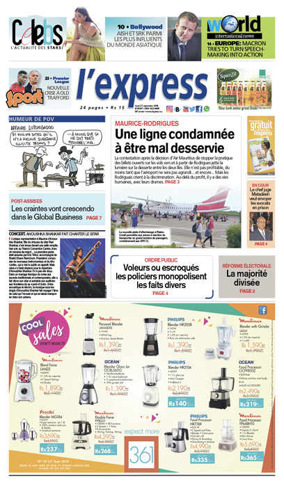 En une : Maurice – Rodrigues : Une ligne condamnée à être mal desservie ; Ordre public – Voleurs ou escroqués, les policiers monopolisent les faits divers ; Post-assises – Les craintes vont crescendo dans le Global Business ; Réforme électorale – La majorité divisée