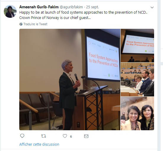 Toutefois, Ameenah Gurib-Fakim assiste à un “side event” : le Food System Approaches to the Prevention of Noncommunicable Diseases (NCDs), qui se tenait le 25 septembre. Sur sa page Twitter l’ex-présidente s’est dit heureuse d’être au lancement de ce projet. Elle semble parfaitement dans son élément, pas du tout dépaysée, au vu des photos postées.