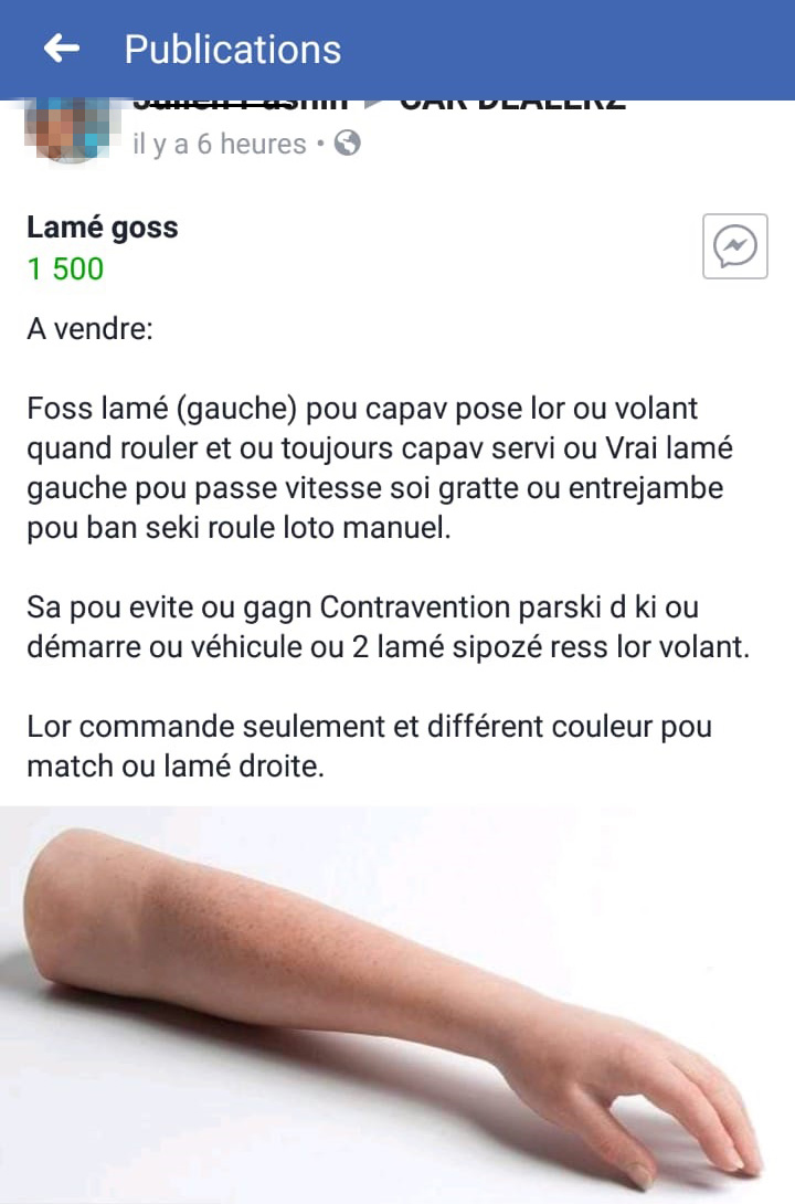 L’internaute précise également que la «fausse main gauche» se vend uniquement sur commande et est disponible en différents coloris «pou match avek ou lame droite».