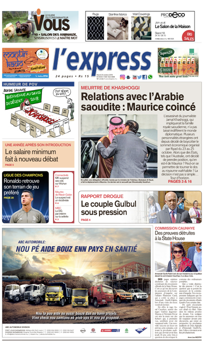 En une : Meurtre de Khashoggi – Relations avec l’Arabie Saoudite : Maurice coincé ; Rapport drogue – Le couple Gulbul sous pression ; Une année après son introduction – Le salaire minimum fait débat