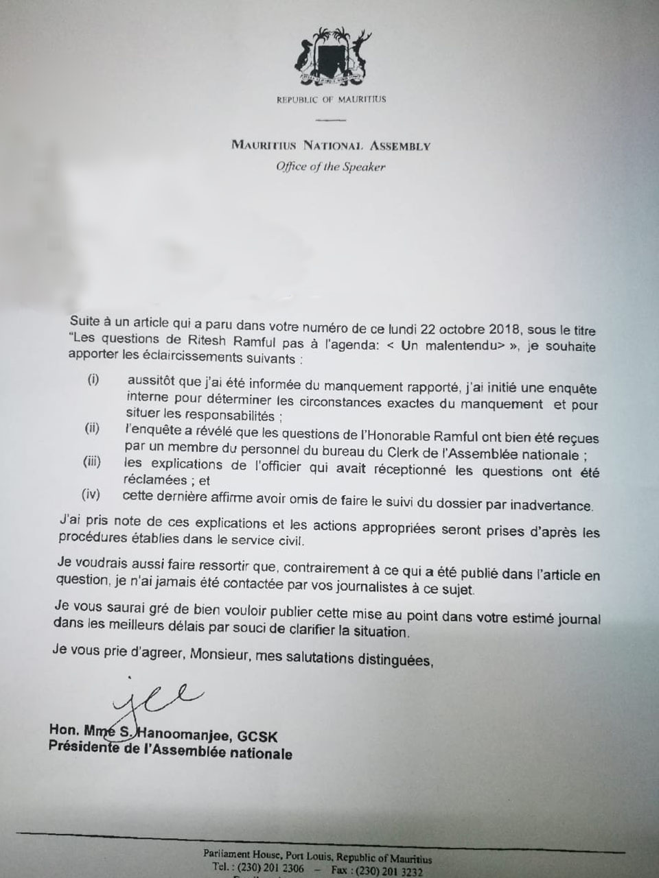 Elle n’a pas tardé à réagir. La Speaker de l’Assemblée nationale a tenu à s’expliquer suite à un article paru dans l’express du lundi 22 octobre. Celui-ci est intitulé : Parlement – Les questions de Ritesh Ramphul pas à l’agenda : «Un malentendu». Voici les éclaircissements apportés par Maya Hanoomanjee.