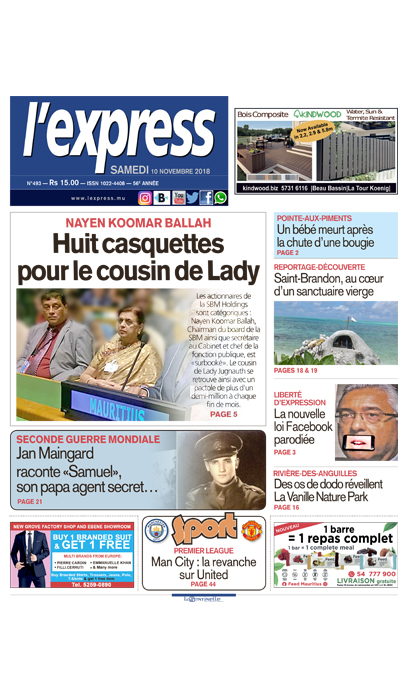 En une, huit casquettes pour Nayen Koomar Ballah, le cousin de Lady. Autres titres : un bébé meurt après la chute d’une bougie et la nouvelle loi Facebook sur la liberté d’expression parodiée.