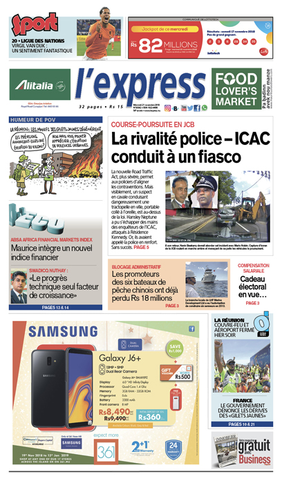 En Une : La rivalité police – ICAC mène à un fiasco. Autre titre : Compensation salariale : Cadeau électoral en vue. Ou encore Les promoteurs des six bateaux de pêche chinois ont déjà perdu Rs 18 millions suite au blocage administratif.
