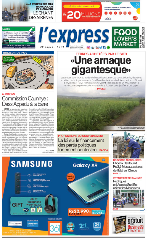 En une : «Une arnaque gigantesque», dit Xavier-Luc Duval au sujet des terres achetées par le SIFB. Autre titre : commission Caunhye : Dass Appadu à la barre.
