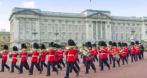 • En photo: Buckingham Palace est le palais où vit la reine Élisabeth II. Il est situé à Londres. Toute la journée, des soldats en uniforme surveillent le bâtiment. Ils se relaient en jouant de la musique militaire !