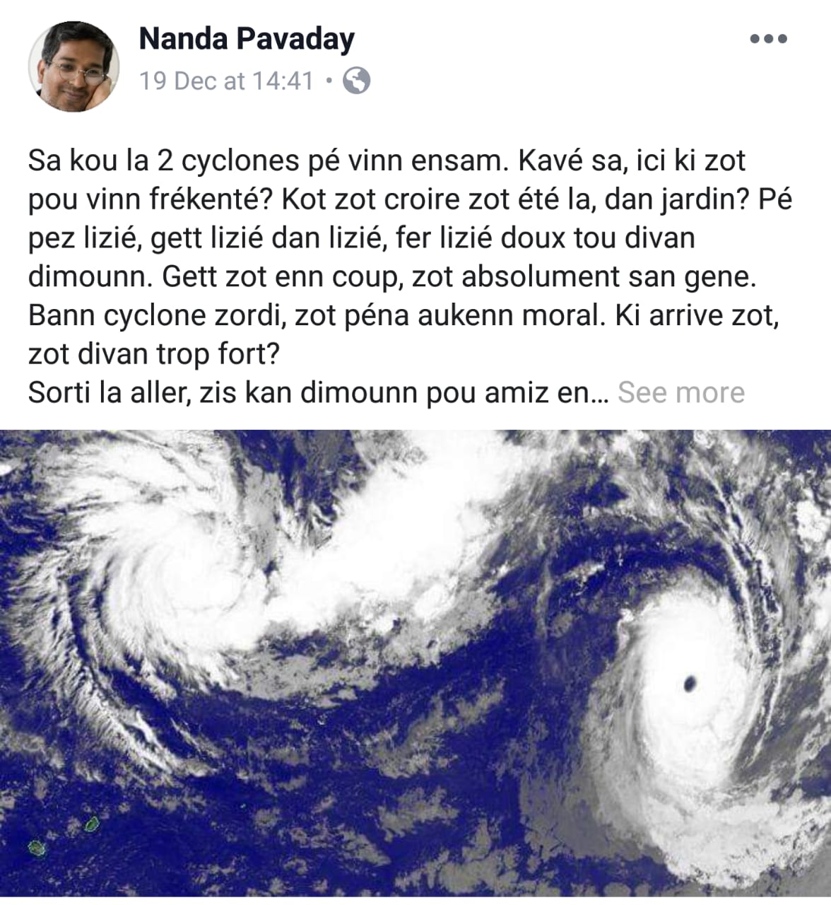 Tout a commencé lorsque la station météorologique de Vacoas a annoncé la présence de deux formations cycloniques dans les parages. La peur commencé à s’installer et Nanda Pavaday en a parlé.