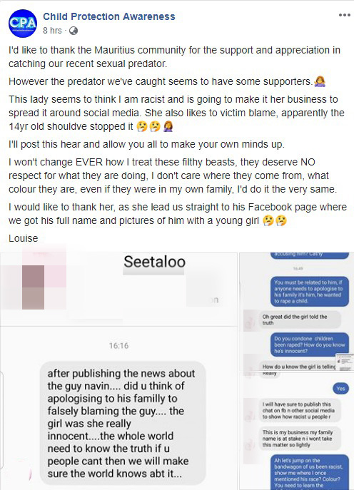 Mais ce matin, la famille du suspect donne une toute autre version de l’histoire. Elle soutient que Navin Seetaloo aurait été piégé par l’association. Des échanges entre une proche et l’association dans lesquels la famille accuse celle-ci de racisme entre autre ont été publiés sur le compte Facebook de l’association.