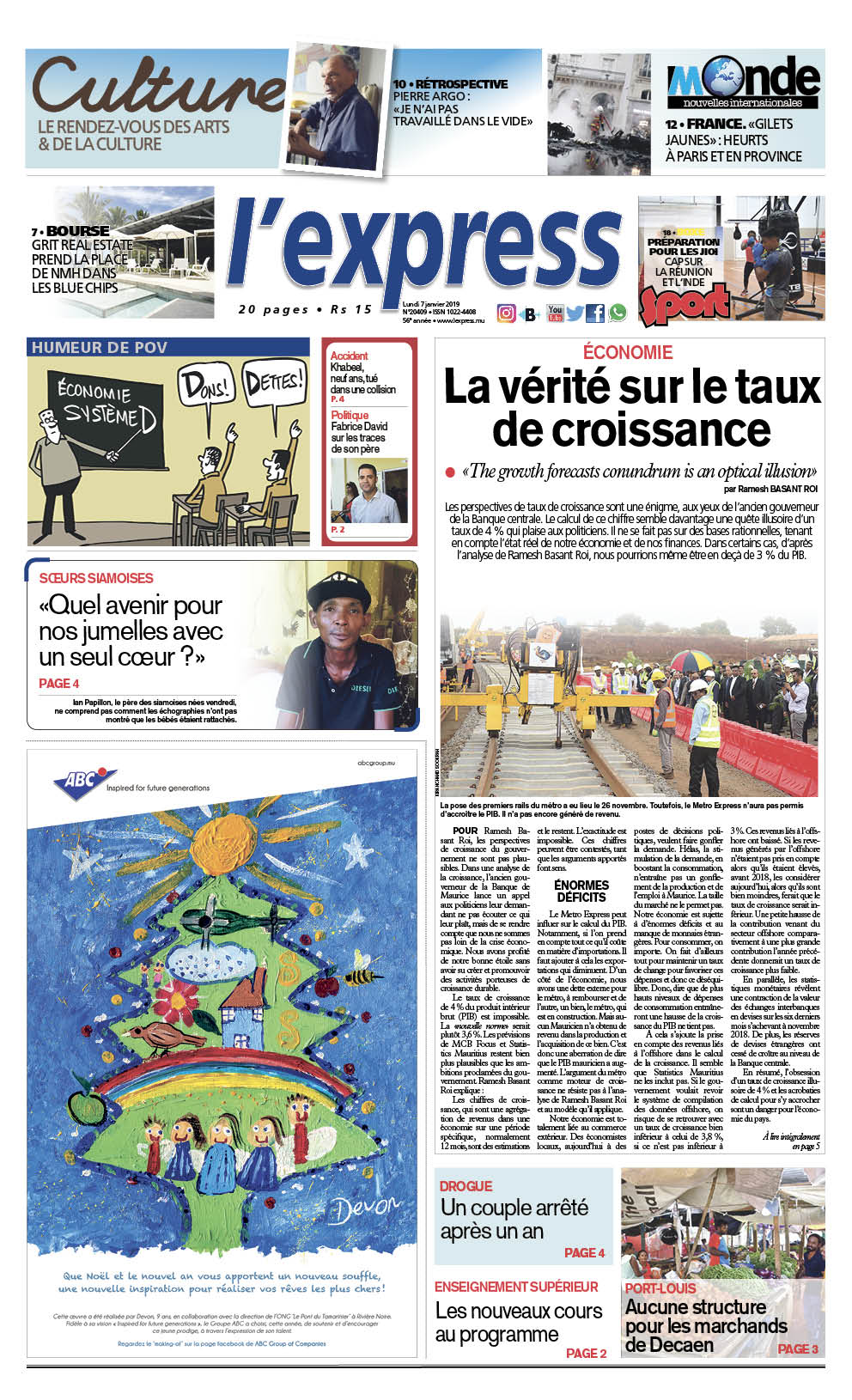En une, Ramesh Basant Roi livre son analyse du taux de croissance. Autres titres : «Quel avenir pour nos jumelles avec un seul coeur ?» dit le père des sœurs siamoises.