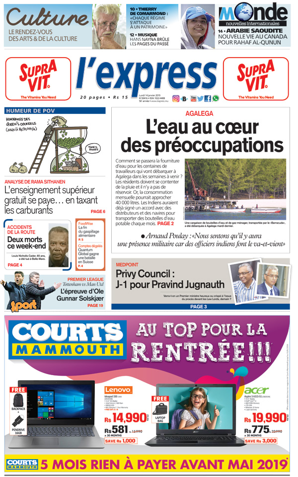 En une: Comment se passera la fourniture d’eau pour les centaines de travailleurs qui vont débarquer à Agalega dans les semaines à venir ? Autre titre: Nous sommes à 24 heures du début de l’appel du DPP devant le Privy Council.