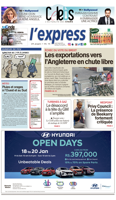Nouvelles inquiétudes des opérateurs économiques après le vote du Parlement britannique sur l’accord du Brexit avec l’Union européenne, qui s’est soldé par un échec mardi. Déjà, l’incertitude qui dure depuis deux ans a plombé le commerce avec la GrandeBretagne. Un manque à gagner qui se chiffre à plusieurs centaines de millions de roupies…