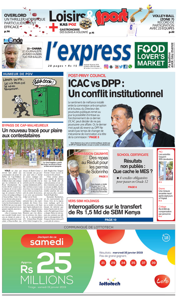 En une: Post-Privy Council – ICAC vs DPP : Un conflit institutionnel ; Commission Caunhye – Des repas au Réduit pour les permis de Sobrinho ; School Certificate – Résultats non publiés : Que cache le MES ?