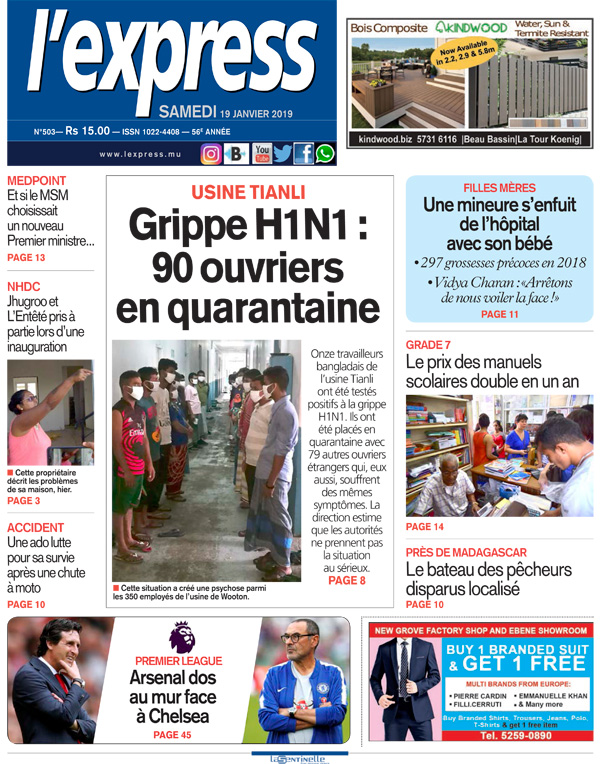 En une, grippe H1N1 : 90 ouvriers en quarantaine. Autres titres : une mineure s’enfuit de l’hôpital avec son bébé et le prix des manuels scolaires de Grade 7 double en un an.