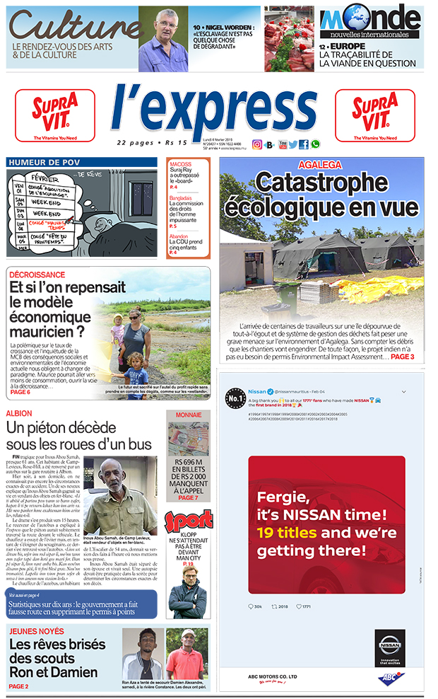 En une : Agalega – Catastrophe écologique en vue ; Décroissance – Et si l’on repensait le modèle économique mauricien ? ; Monnaie – Rs 696 M en billets de Rs 2 000 manquent à l’appel.