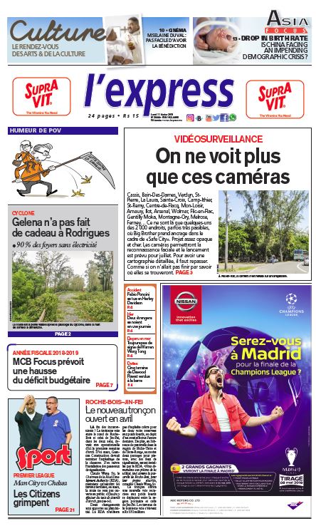 En une : Vidéosurveillance – On ne voit plus que ces caméras ; Cyclone – Gelena n’a pas fait de cadeau à Rodrigues ; Année fiscale 2018-2019 – MCB Focus prévoit une hausse du déficit budgétaire.
