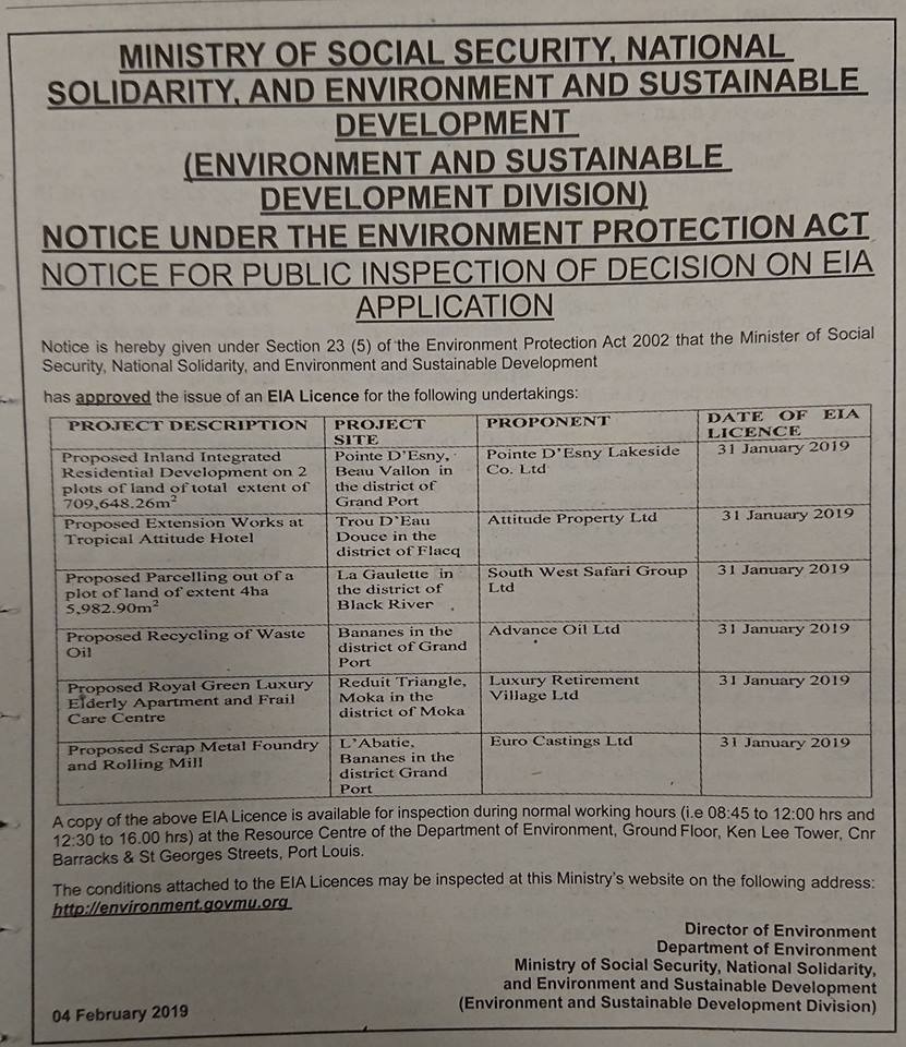 Le 31 janvier 2019. C’est la date à laquelle le ministère de l’Environnement a accordé un permis Environmental Impact Assessment (EIA) à la Pointe d’Esny Lakeside Co Ltd, pour son projet de village intégré. Soit, presque un an après le lancement officiel, le 22 février 2018, du projet par la société qui appartient à 100 % à la Compagnie de Beau Vallon Ltée.