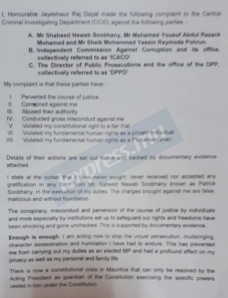 Convoqué à la suite de la demande du Directeur des poursuites publiques (DPP) à la police d’enquêter sur un document remis à la presse, Raj Dayal retourne la situation et fait croire qu’il est l’instigateur de cette rencontre avec les policiers.