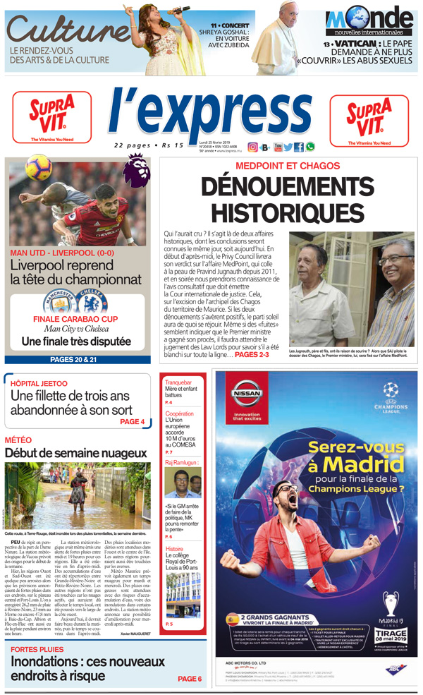 Qui l’aurait cru ? Il s’agit là de deux affaires historiques, dont les conclusions seront connues le même jour, soit aujourd’hui. En début d’après-midi, le Privy Council livrera son verdict sur l’affaire MedPoint, qui colle à la peau de Pravind Jugnauth depuis 2011, et en soirée nous prendrons connaissance de l’avis consultatif que doit émettre la Cour internationale de justice. Cela, sur l’excision de l’archipel des Chagos du territoire de Maurice. Si les deux dénouements s’avèrent positifs, le parti soleil aura de quoi se réjouir. Même si des «fuites» semblent indiquer que le Premier ministre a gagné son procès, il faudra attendre le jugement des Law Lords pour savoir s’il a été blanchi sur toute la ligne…