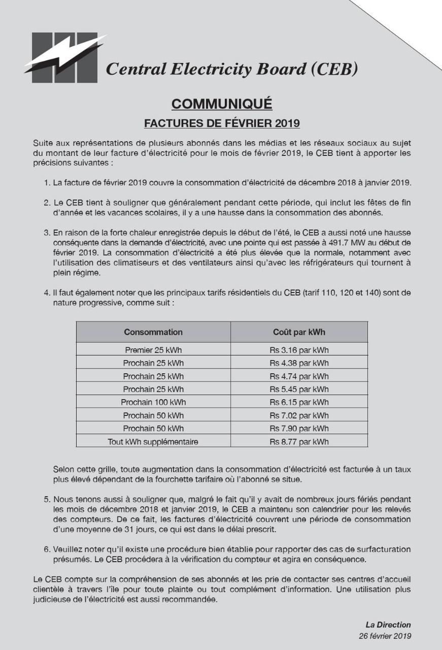 Le communiqué est visible sur la page Facebook du CEB. Suite aux plaintes et complaintes des abonnés, à la fois dans les médias et sur les réseaux sociaux, l’organisme tient à apporter des éclaircissements sur son mode de facturation.