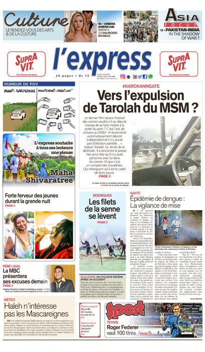 En une : #Karokanngate – Vers l’expulsion de Tarolah du MSM ? ; Maha Shivaratree – Forte ferveur des jeunes durant la grande nuit ; Père Laval – La MBC présentera ses excuses demain