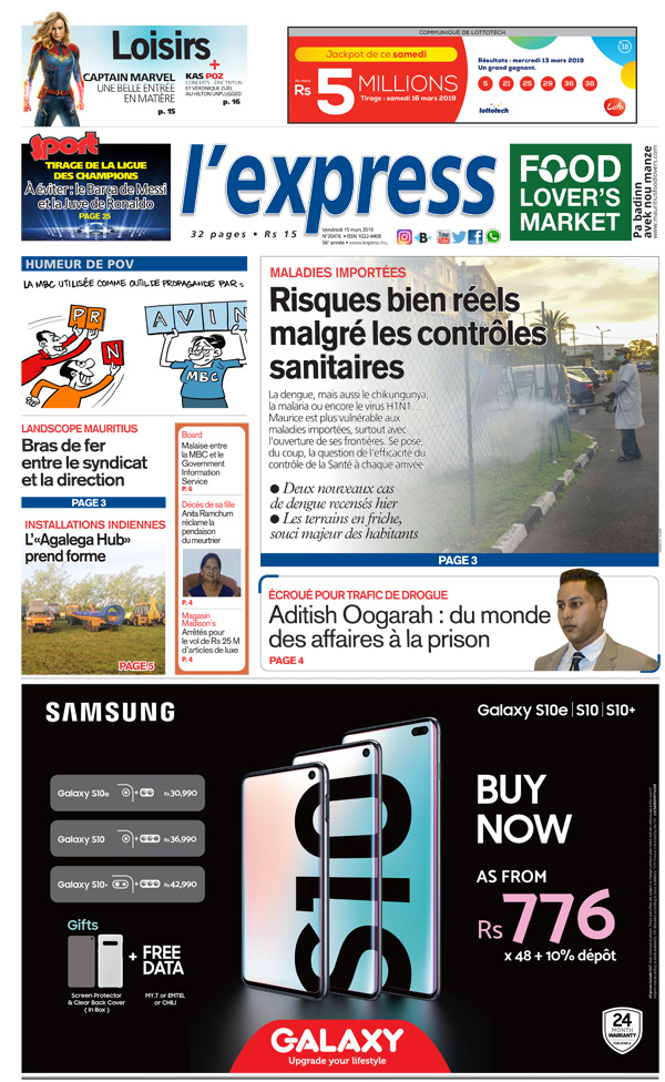 En une : Maladies importées – Risques bien réels malgré les contrôles sanitaires ; Écroué pour trafic de drogue - Aditish Oogarah : du monde des affaires à la prison ; Installations indiennes – L’«Agalega Hub» prend forme