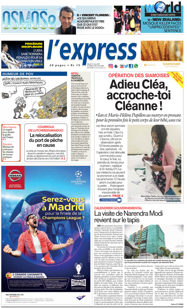 En une: Opération des siamoises – Adieu Cléa, accroche-toi Cléanne ! ; Courroux de Lutchmeenaraidoo – La relocalisation du port de pêche en cause ; Metro Express – Un expert pour étudier la grotte de Chebel