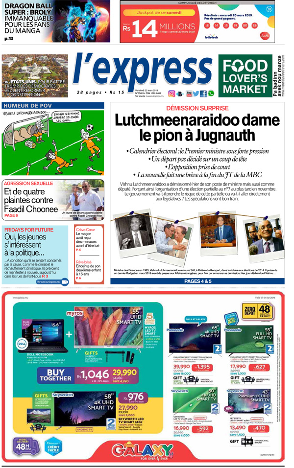 En une : Démission surprise – Lutchmeenaraidoo dame le pion à Jugnauth ; Agression sexuelle – Et de quatre plaintes contre Faadil Choonee ; Fridays for Future – Oui, les jeunes s’intéressent à la politique…
