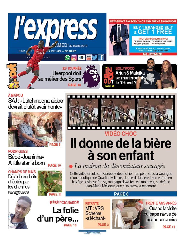 En une : Vidéo choc – Il donne de la bière à son enfant ; Trente and après – Quand la visite du pape ravive de beaux souvenirs ; Bébé poignardé – La folie d’un père… ; À Mapou – «Lutchmeenaraidoo devrait plutôt avoir honte»