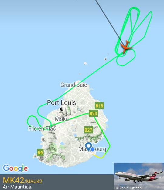 Avant de pouvoir atterrir, l’avion a fait plusieurs boucles au nord-est de Maurice afin de larguer du carburant pour pouvoir atteindre le poids recommandé pour l’atterrissage. De ce fait, l’avion a touché le sol ce matin, à 1 h 28.