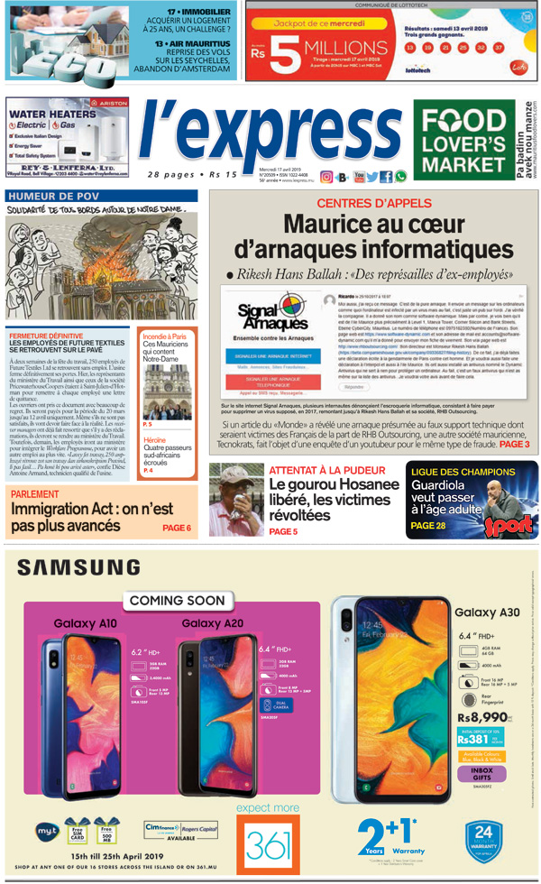 En une : Centres d’appels – Maurice au cœur d’arnaques informatiques ; Parlement – Immigration Act : on n’est pas plus avancés ; Attentat à la pudeur – Le gourou Hosanee libéré, les victimes révoltées