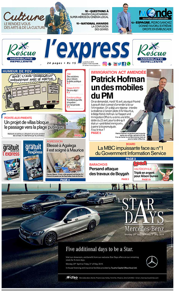 On se demandait, mardi 16 avril, pourquoi Pravind Jugnauth était si pressé d’amender la loi sur l’immigration. On a déjà une réponse : interdire la résidence à l’ancien pilote d’Air Mauritius, le Belge Patrick Hofman. Le Passport and Immigration Office lui a remis une lettre datée du 23 avril, pour lui dire qu’il était un «prohibited immigrant», à peine la loi promulguée. A qui le tour ?