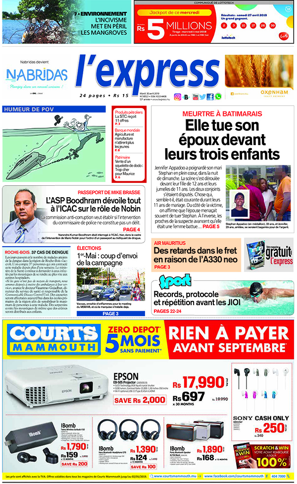 En une : Meurtre à Batimarais – Elle tue son époux devant leurs trois enfants ; Élections – 1er-Mai : coup d’envoi de la campagne ; Air Mauritius – Des retards dans le fret en raison de l’A330 neo