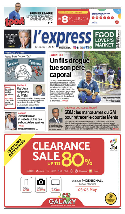 En une : Parricide – Un fils drogué tue son père caporal ; Créances douteuses à Dubaï – SBM : les manœuvres du GM pour retracer le courtier Mehta ; Politique – Raj Dayal suspendu du MSM