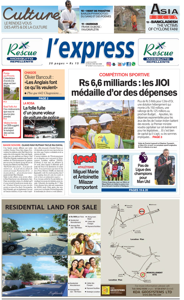 En une : Compétition sportive – Rs 6,6 milliards: les JIOI médaille d’or des dépenses ; La Rosa – La folle fuite d’un jeune voleur de voiture de police ; Chagos – Olivier Bancoult : «Les Anglais font ce qu’ils veulent»