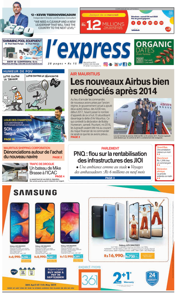 En une - Air Mauritius: les nouveaux Airbus bien renégociés après 2014 ; Autre titre: PNQ: flou sur la rentabilisation des infrastructures des JIOI.