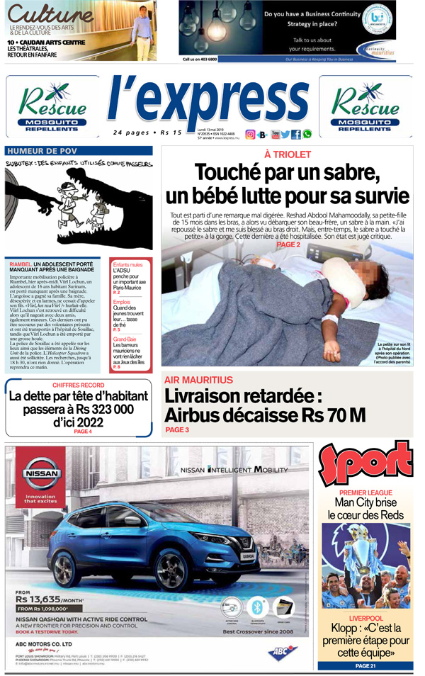 En une - À Triolet : touché par un sabre, un bébé lutte pour sa survie : Autre titre : Air Mauritius - Livraison retardée : Airbus décaisse Rs 70 M.