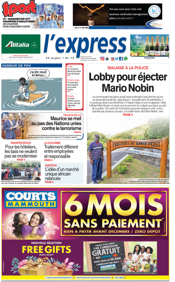 En une : Malaise à la police – Lobby pour éjecter Mario Nobin ; Projets de loi – Maurice se met au pas des Nations unies contre le terrorisme ; Aviation – l’idée d’un marché unique africain relancée