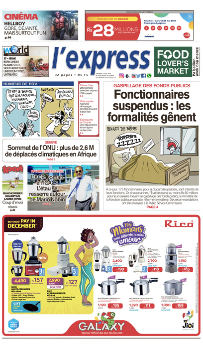 En une : Gaspillage des fonds publics – Fonctionnaires suspendus : les formalités gênent ; Genève – Sommet de l’ONU : plus de 2,6 millions de déplacés climatiques en Afrique ; Affaire Mike Brasse – L’ACP Domah à l’ICAC : l’étau se resserre autour de Mario Nobin