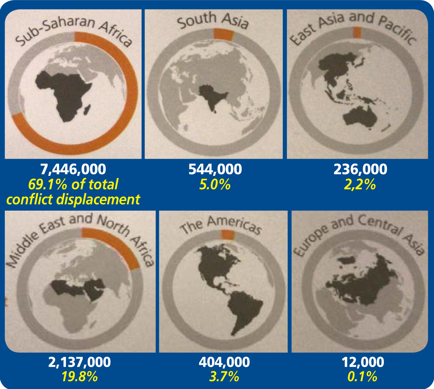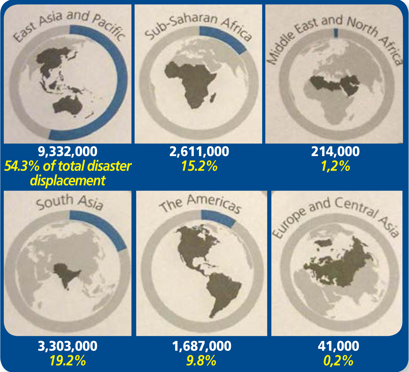 À travers le globe, les chiffres de déplacements liés aux catastrophes naturelles atteignent 17,2 millions dans 144 pays de par le monde, en 2018. Tempêtes, cyclones, inondations liées à la mousson ont déplacé plus de 9 millions de personnes en Asie de l’Est-Pacifique. Uniquement aux Philippines, on en a recensé quelque 3,8 millions. En Afrique, ils sont plus de 2,6 millions. En Asie du Sud, la mousson a provoqué le déplacement de 2,7 millions en Inde seulement. La sécheresse aussi provoque le déplacement d’individus. Si on prend l'Afghanistan, le Brésil, le Burundi, l’Éthiopie, l’Iraq, Madagascar, la Mongolie, le Sénégal et la Somalie, on compte près d’un million de déplacés en raison du manque d’eau.