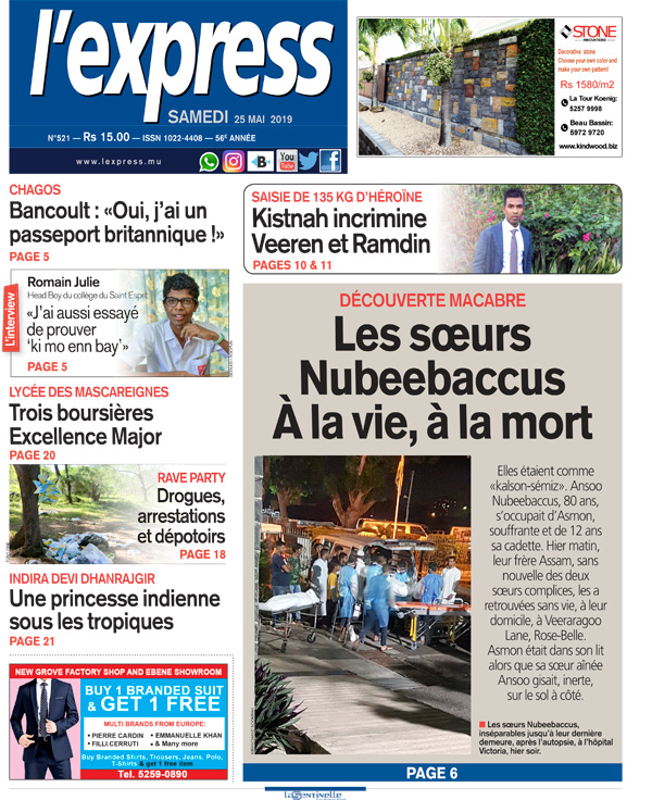 En une : Découverte macabre – Les sœurs Nubeebaccus, À la vie, à la mort ; Saisie de 135 kg d’héroïne – Kistnah incrimine Veeren et Ramdin ; Chagos – Bancoult : «Oui, j’ai un passeport britannique !».