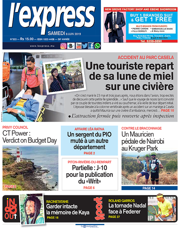 En une : Accident au parc Casela – Une touriste repart de sa lune de miel sur une civière ; Privy Council – CT Power : verdict on Budget Day ; Piton–Rivière-du-Rempart – Partielle : J-10 pour la publication du «Writ»
