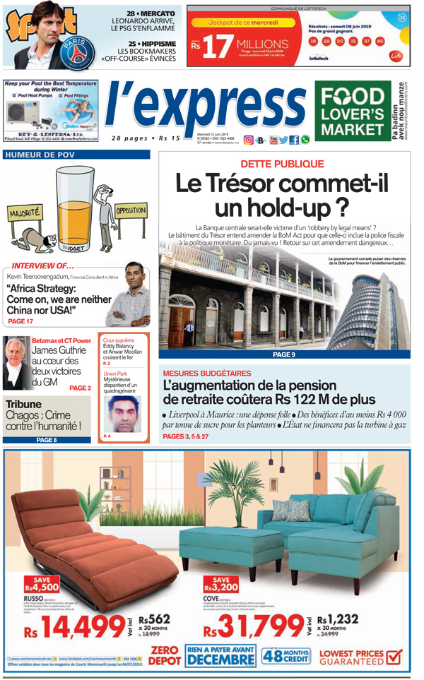 En une - Dette publique: le Trésor commet-il un hold-up ? Autre titre: Mesures budgétaires: l’augmentation de la pension de retraite coûtera Rs 122 M de plus.