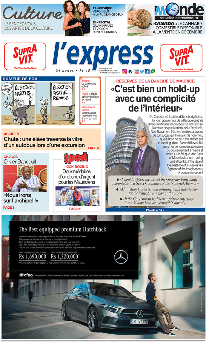 En une : Puiser des réserves de la Banque centrale – «C’est bien un hold-up avec une complicité de l’intérieur», dit Ramesh Basant Roi. Autre titre : les nouveaux maires connus à la fin du mois. Egalement dans l’actualité : Kick-boxing – deux médailles d’or et une d’argent pour les Mauriciens
