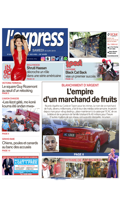 En une : Blanchiment d’argent – L’empire d’un marchand de fruits ; L’avion Chagos – «Les lezot gete, mo kone kouma été andan mwa» ; Grand-Baie – Chiens, poules et canards au banc des accusés