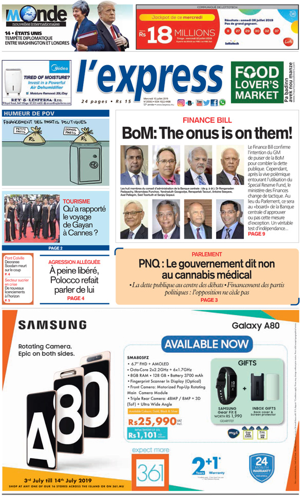 En une - Finance bill - BoM: The onus is on them! Autre titre: Parlement - PNQ: le gouvernement dit non au cannabis médical.