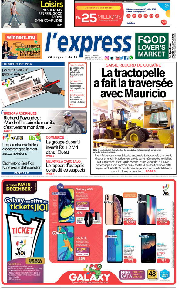 En une - Saisie record de cocaïne: la tractopelle a fait la traversée avec Mauricio ; Autre titre: Commerce: le groupe Super U investit Rs 1,2 Md dans l’Ouest.