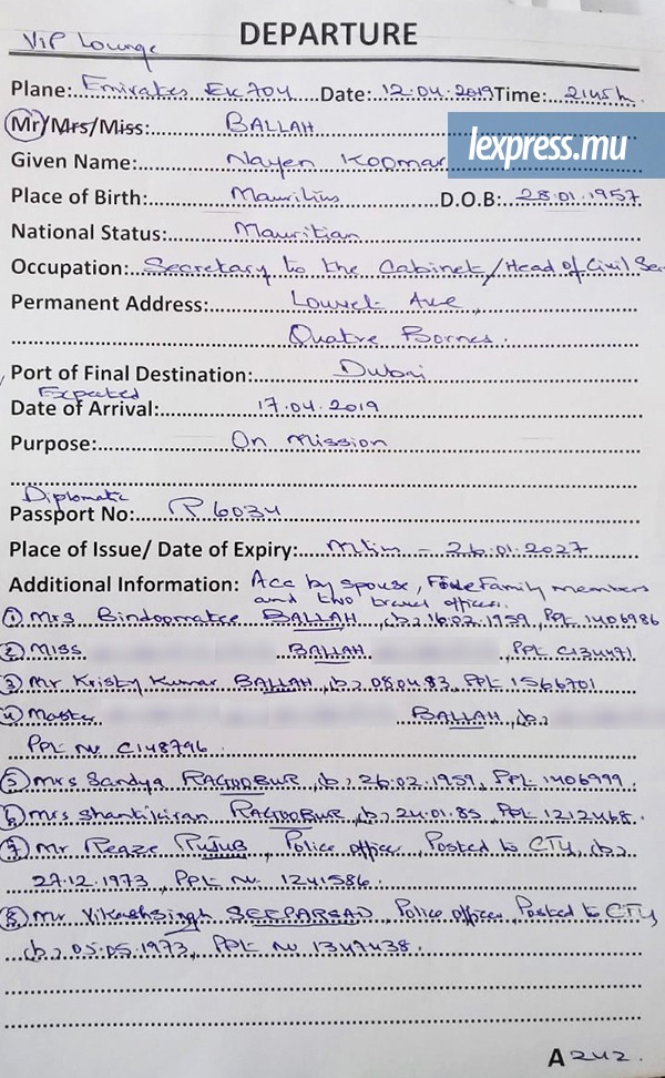 Diffusée sur Internet le 9 juin, l’émission d’investigation avait produit le passeport de Lilram Deal, le policier-enchef de la CTU. Document qui a permis de retracer tous ses voyages : il en fait près de 50 depuis sa prise de fonction, et il a passé près de huit mois en voyage ces derniers quatre ans. Toutes ces missions ont été validées par Nayen Koomar Ballah. Parmi la documentation produite par Menteur Menteur, on retrouve un extrait du log book officiel du VIP Lounge de l’aéroport, qui démontre que deux officiers de la CTU ont accompagné – en tant que «travel officers» - Nayen Koomar Ballah lors d’un voyage avec toute sa famille à Dubaï, le 12 avril 2019.