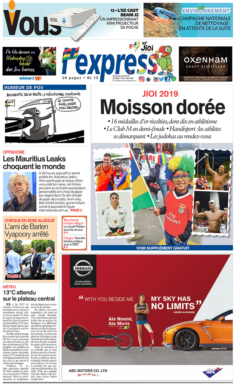 En une : JIOI 2019 – Moisson dorée ; Offshore – Les Mauritius Leaks choquent le monde ; Chèque en bois allégué – L’ami de Barlen Vyapoory arrêté.