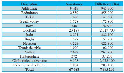 Rs 7 895 100. C’est le montant obtenu de la vente des billets durant cette 10e édition des Jeux des îles de l’océan Indien. En effet, en incluant les deux cérémonies d’ouverture et de clôture, on a recensé 67 388 personnes qui ont payé pour assister aux différentes disciplines au programme. La plus grande affluence reste au football, où 23 177 personnes s’y sont rendues pour un coût total de Rs 2 317 700. Ci-contre, un aperçu de l’assistance par discipline…
